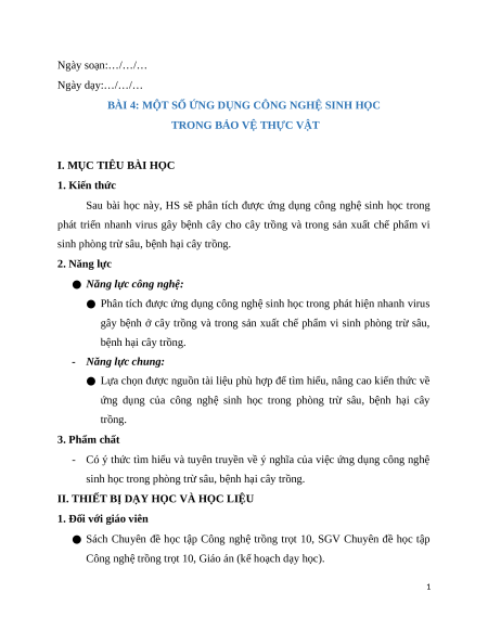 Giáo án chuyên đề Bài 4: Ứng dụng công nghệ sinh học trong bảo vệ thực vật Công nghệ trồng trọt 10 Kết nối tri thức