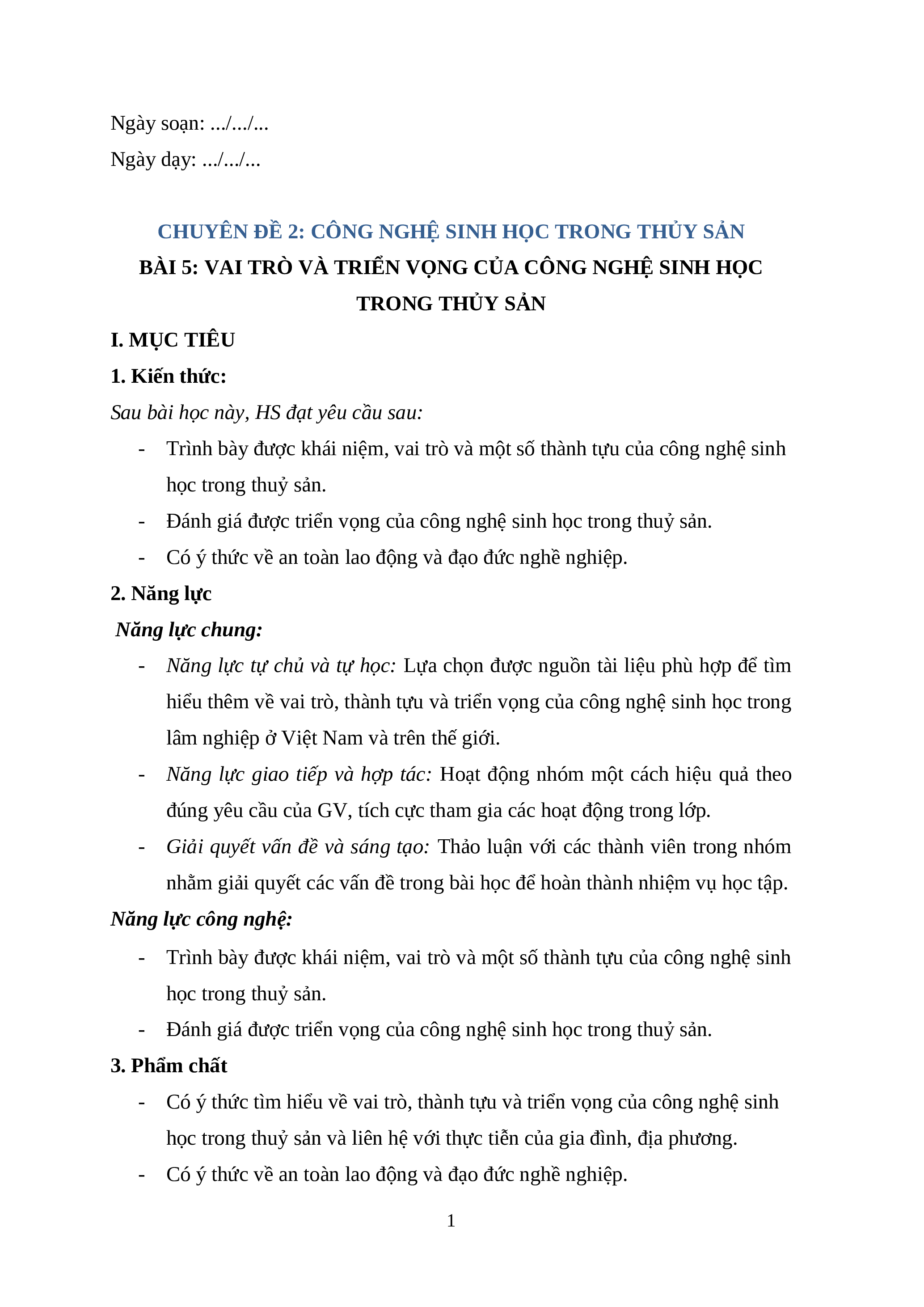 BÀI 5: VAI TRÒ VÀ TRIỂN VỌNG CỦA CÔNG NGHỆ SINH HỌC TRONG THỦY SẢN I. MỤC TIÊU 1. Kiến thức: