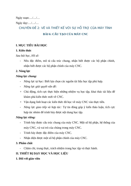 Giáo án chuyên đề Bài 6: Cấu tạo của máy CNC Công nghệ cơ khí 11 Kết nối tri thức