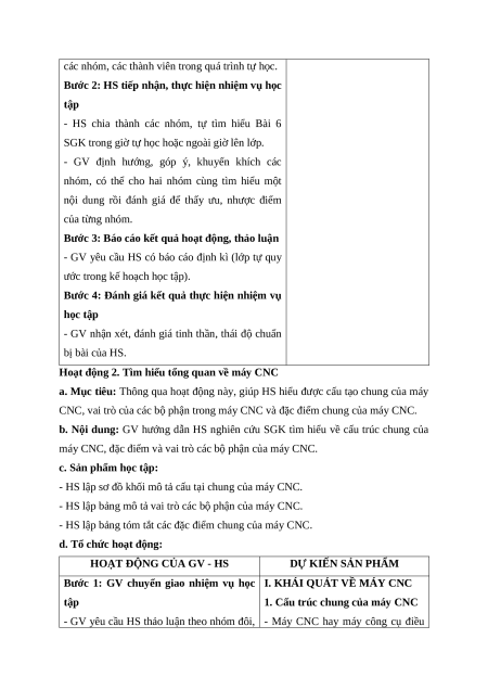 - HS lập được bảng tóm tắt các đặc điểm chung của máy CNC.