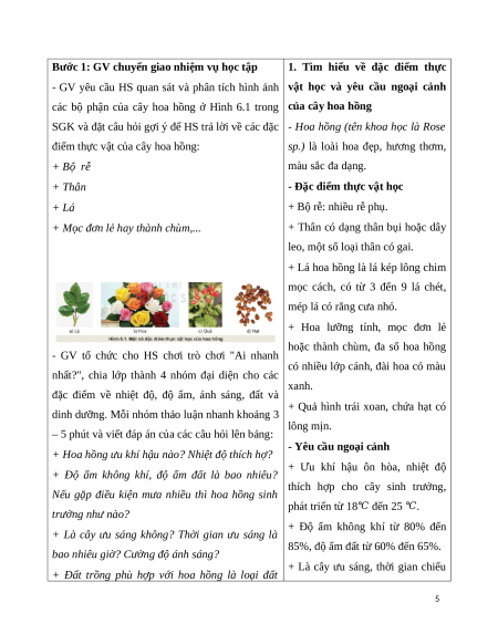 Hoạt động 1: Tìm hiểu về đặc điểm thực vật học và yêu cầu ngoại cảnh của cây hoa hồng