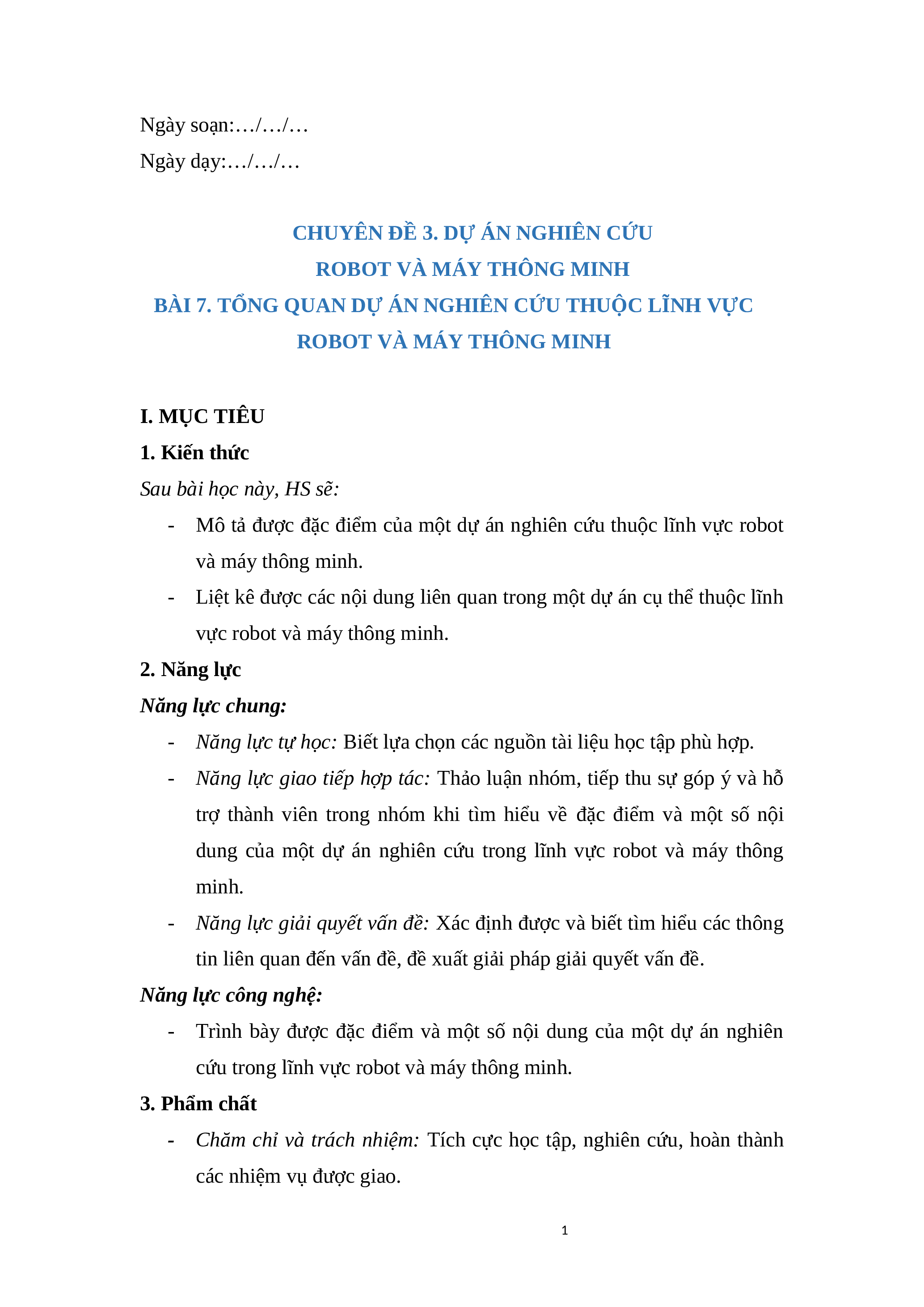 ROBOT VÀ MÁY THÔNG MINH I. MỤC TIÊU 1. Kiến thức