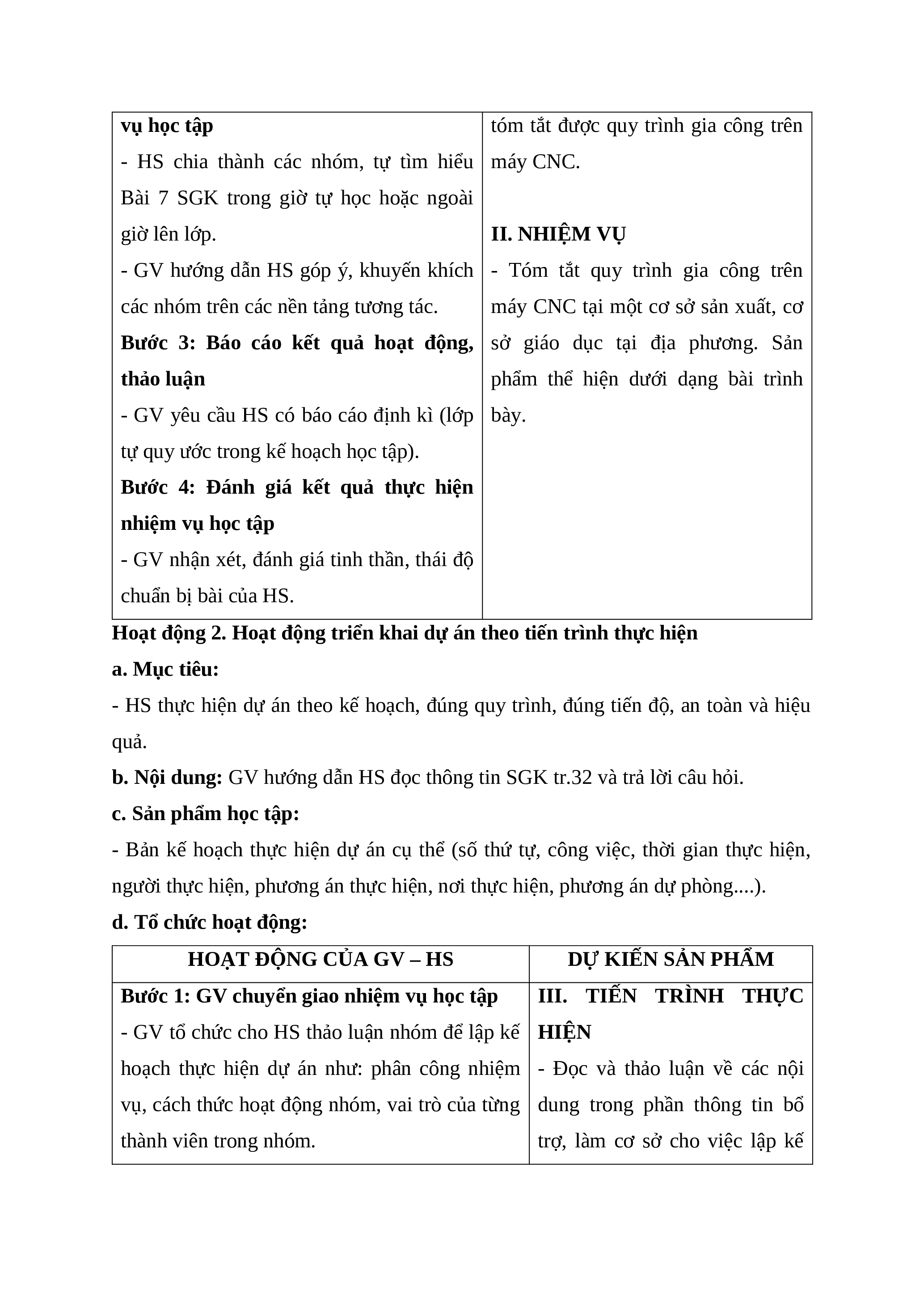Hoạt động 2. Hoạt động triển khai dự án theo tiến trình thực hiện a. Mục tiêu:
