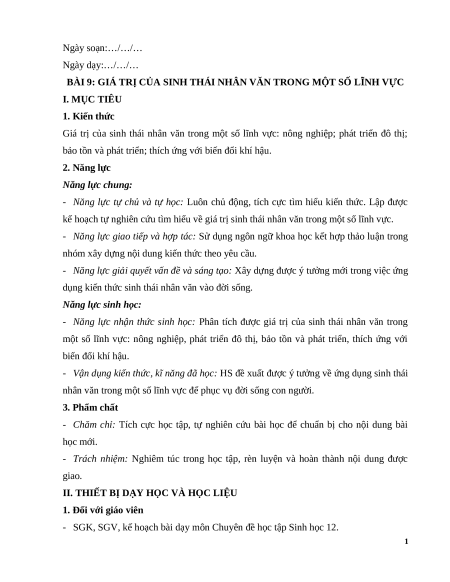 BÀI 9: GIÁ TRỊ CỦA SINH THÁI NHÂN VĂN TRONG MỘT SỐ LĨNH VỰC I. MỤC TIÊU 1. Kiến thức