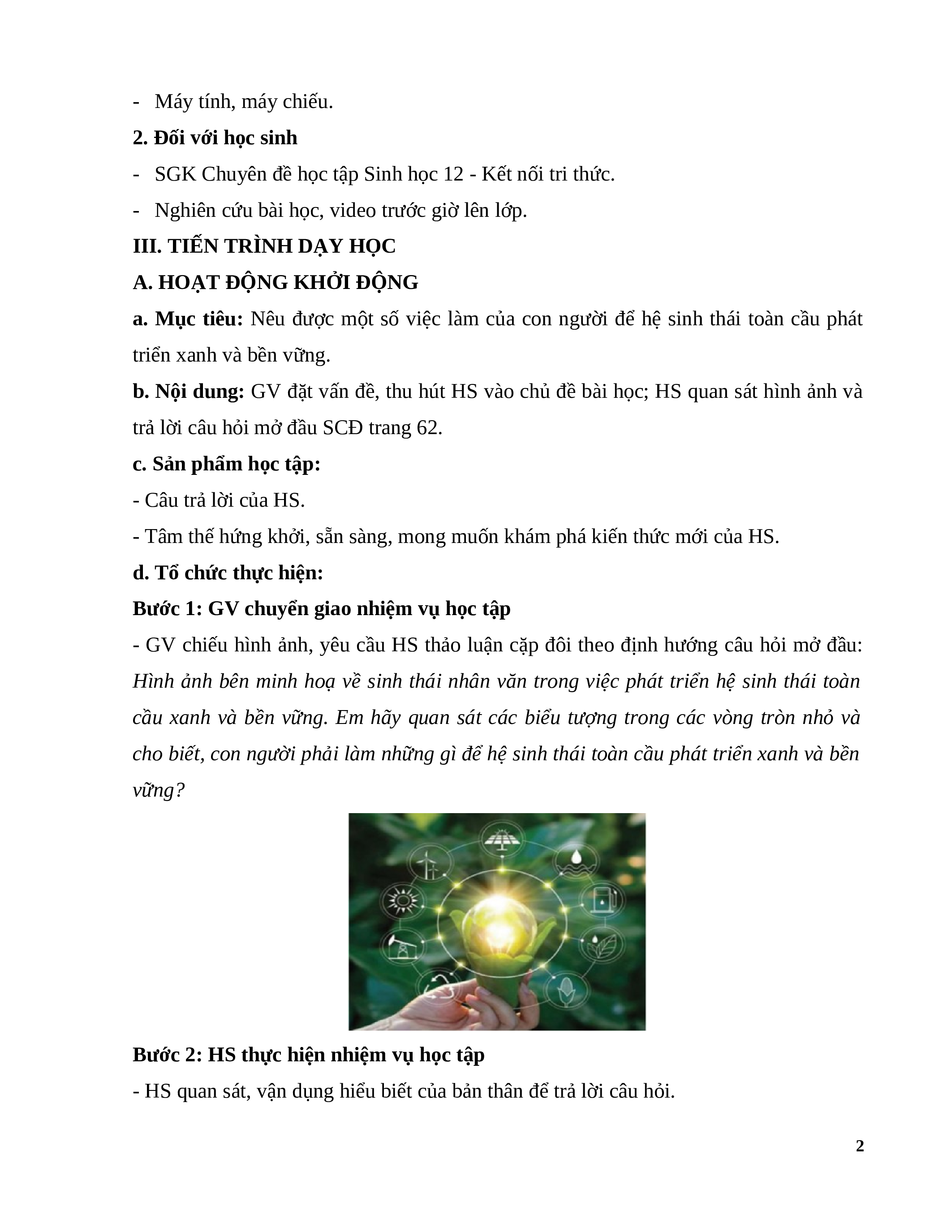 a. Mục tiêu: Nêu được một số việc làm của con người để hệ sinh thái toàn cầu phát triển xanh và bền vững.
