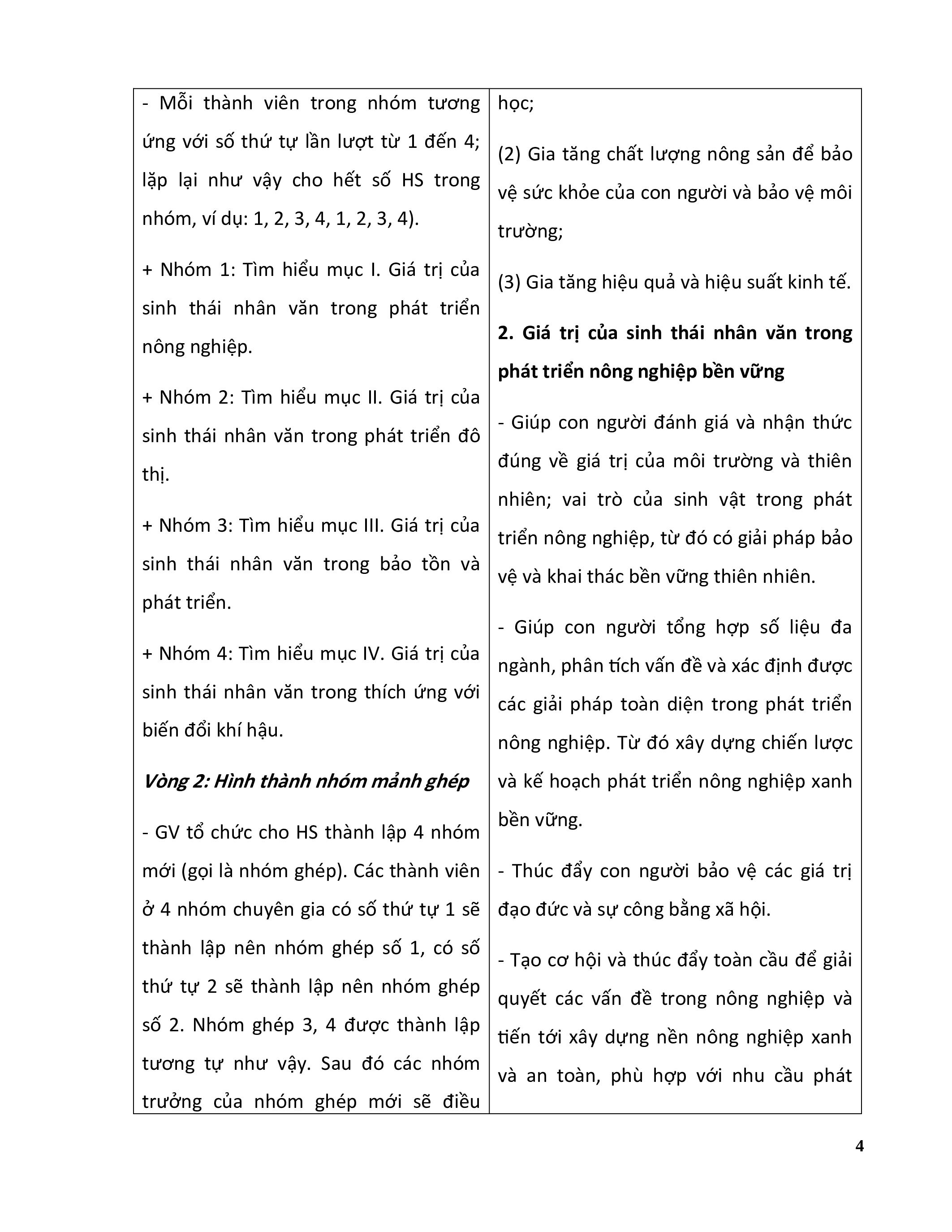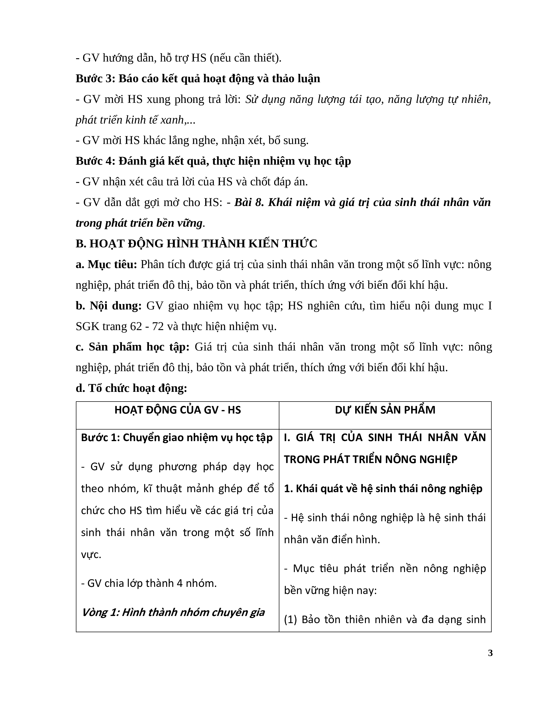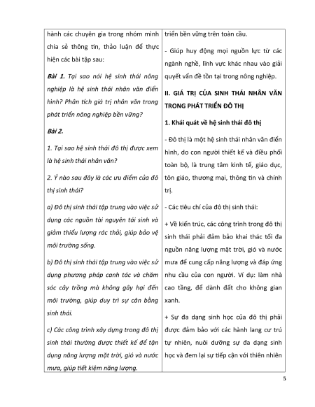 a. Mục tiêu: Phân tích được giá trị của sinh thái nhân văn trong một số lĩnh vực: nông