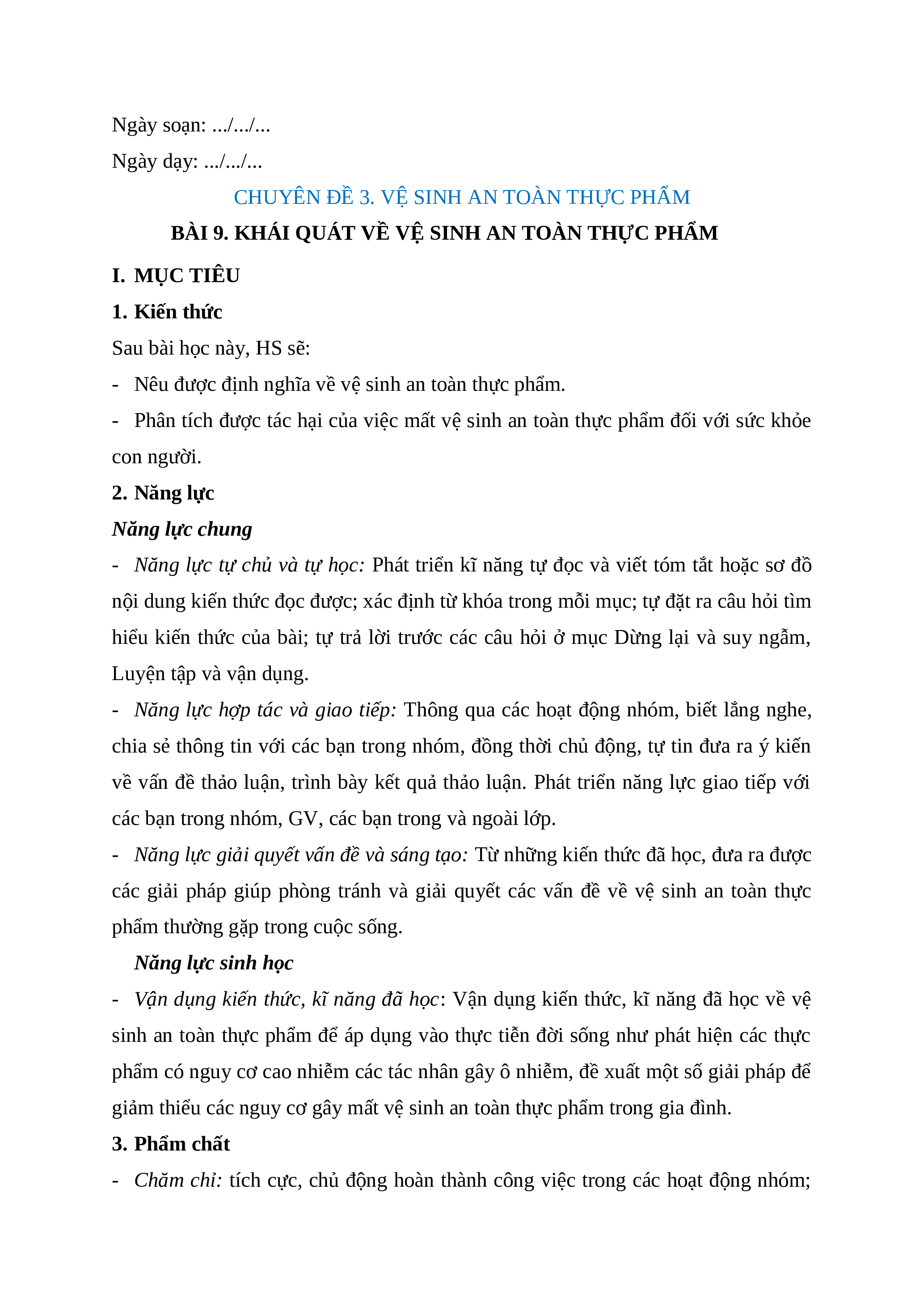 BÀI 9. KHÁI QUÁT VỀ VỆ SINH AN TOÀN THỰC PHẨM I. MỤC TIÊU 1. Kiến thức Sau bài học này, HS sẽ: