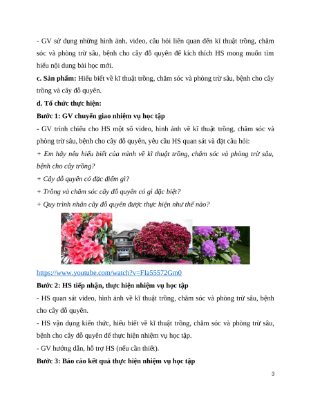 - HS quan sát video, hình ảnh về kĩ thuật trồng, chăm sóc và phòng trừ sâu, bệnh cho cây đỗ quyên.