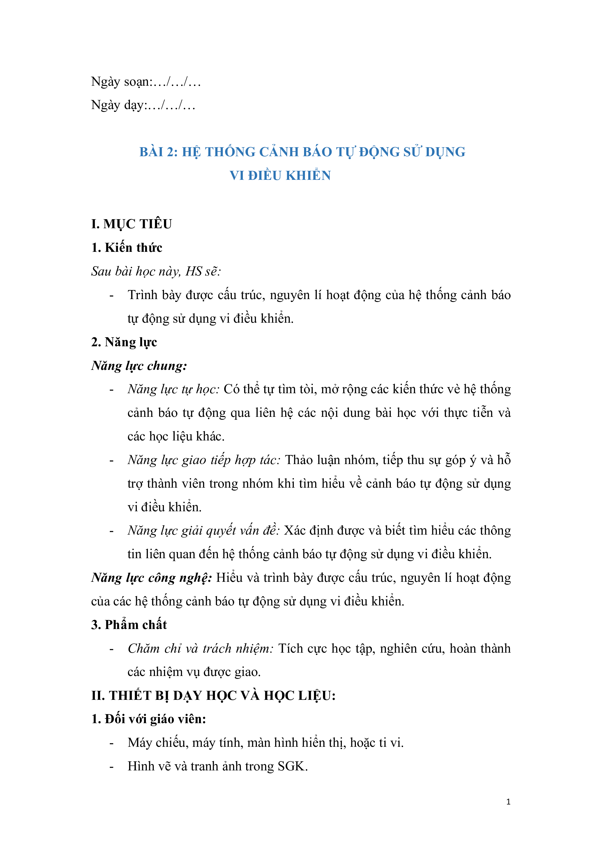 BÀI 2: HỆ THỐNG CẢNH BÁO TỰ ĐỘNG SỬ DỤNG VI ĐIỀU KHIỂN I. MỤC TIÊU 1. Kiến thức