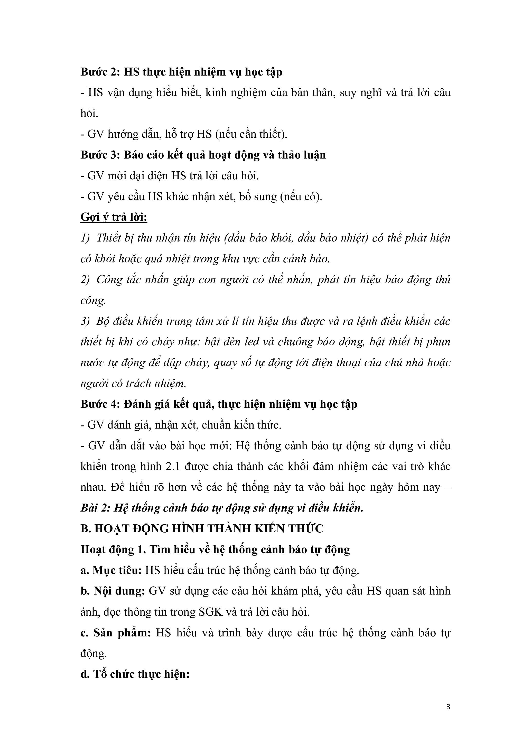 c. Sản phẩm: HS hiểu và trình bày được cấu trúc hệ thống cảnh báo tự động.