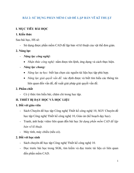 BÀI 2: SỬ DỤNG PHẦN MỀM CAD ĐỂ LẬP BẢN VẼ KĨ THUẬT I. MỤC TIÊU BÀI HỌC 1. Kiến thức Sau bài học, HS sẽ: