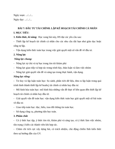 BÀI 7: ĐẦU TƯ TÀI CHÍNH. LẬP KẾ HOẠCH TÀI CHÍNH CÁ NHÂN I. MỤC TIÊU: