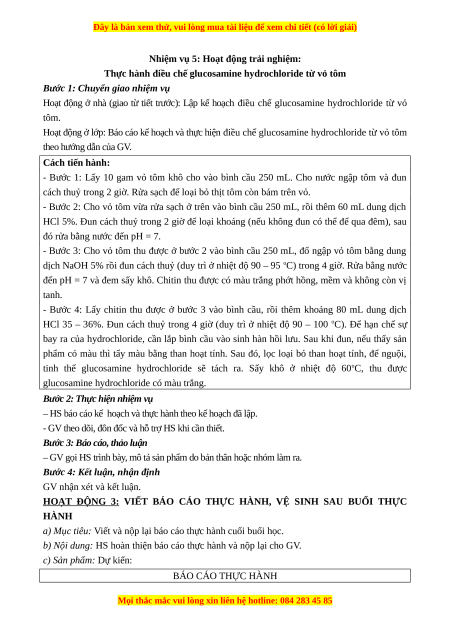 Hoạt động ở lớp: Báo cáo kế hoạch và thực hiện điều chế glucosamine hydrochloride từ vỏ tôm