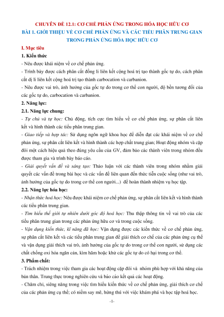 CHUYÊN ĐỀ 12.1: CƠ CHẾ PHẢN ỨNG TRONG HÓA HỌC HỮU CƠ