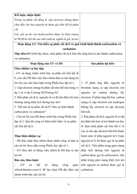 Mục tiêu: HS trình bày được sự phân cắt đồng li liên kết cộng hóa trị tạo thành gốc tự do
