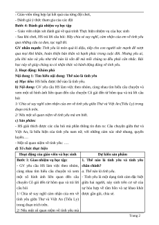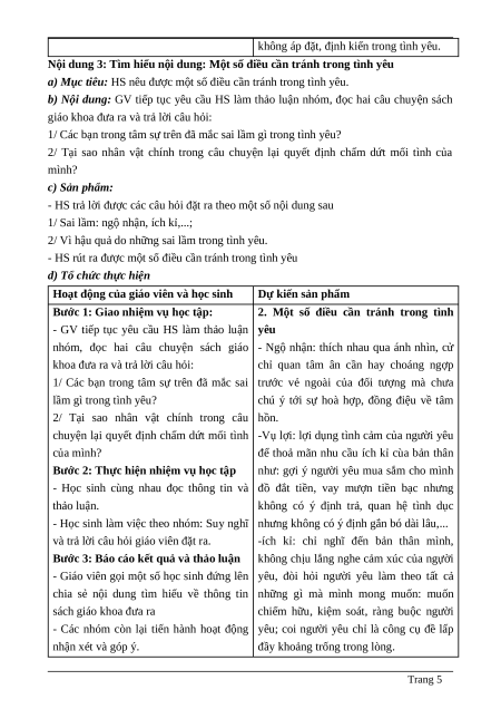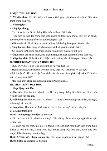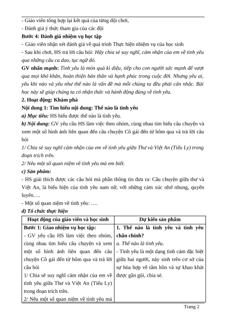 1. Về kiến thức: HS hiểu được thế nào là tình yêu chân chính và một số điếu cần tránh trong tình yêu. 2. Về năng lực - Năng lực chung