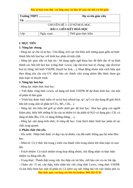 BÀI 1: LIÊN KẾT HOÁ HỌC Lớp: Ngày soạn: Thời gian thực hiện: I. MỤC TIÊU 1. Năng lực chung