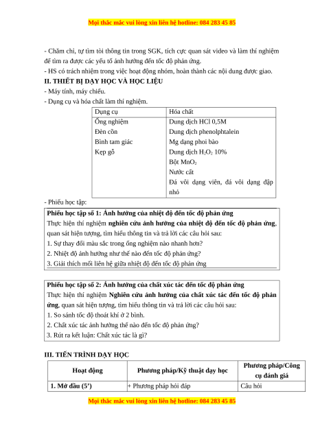 Phiếu học tập số 1: Ảnh hưởng của nhiệt độ đến tốc độ phản ứng