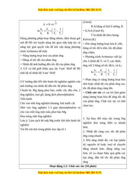 2. GV giới thiệu phương trình Arrhenius để HS biết