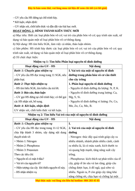 Nhiệm vụ 2: Tìm hiểu Vai trò của một số nguyên tố dinh dưỡng