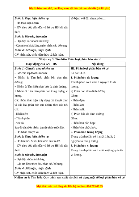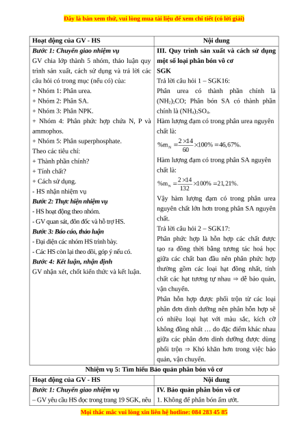 a) Mục tiêu: Biết các loại phân bón vô cơ; vai trò của phân bón vô cơ; quy trình sản xuất, sử