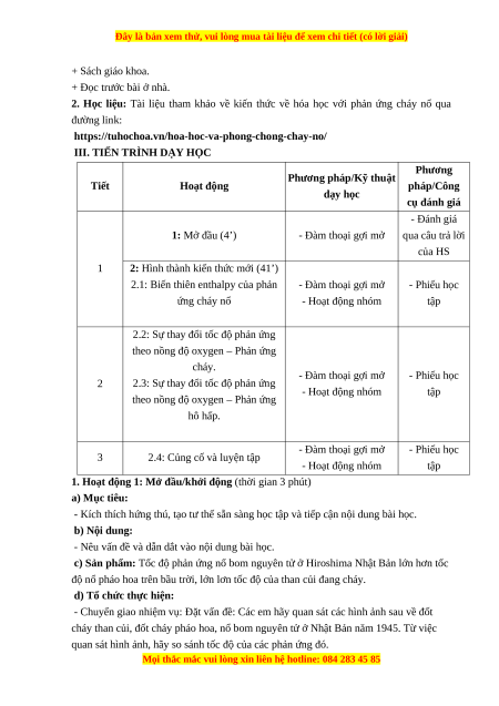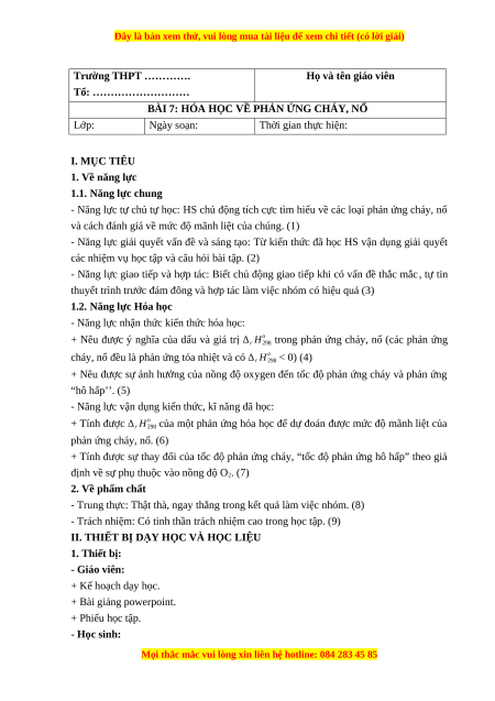 BÀI 7: HÓA HỌC VỀ PHẢN ỨNG CHÁY, NỔ Lớp: Ngày soạn: Thời gian thực hiện: I. MỤC TIÊU 1. Về năng lực 1.1. Năng lực chung