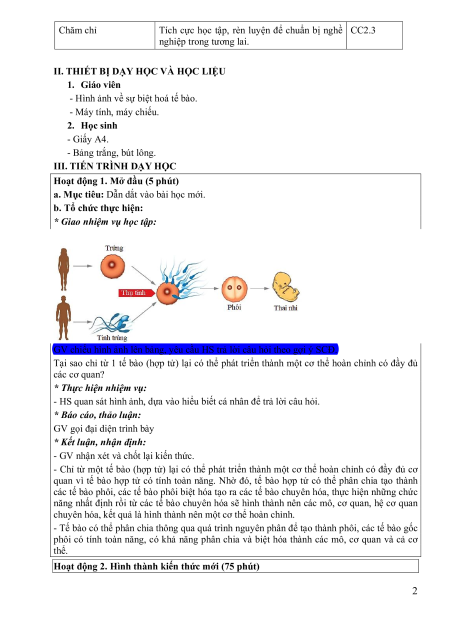 năng nhất định rôi từ các tế bào chuyên hóa se hình thành nên các mô, cơ quan, hệ cơ quan