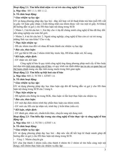+ Nhóm 1: Tìm hiểu về đặc trưng của công nghệ tế bào thực vật và trở lời câu hỏi 4, 5.