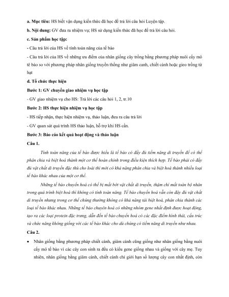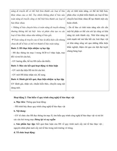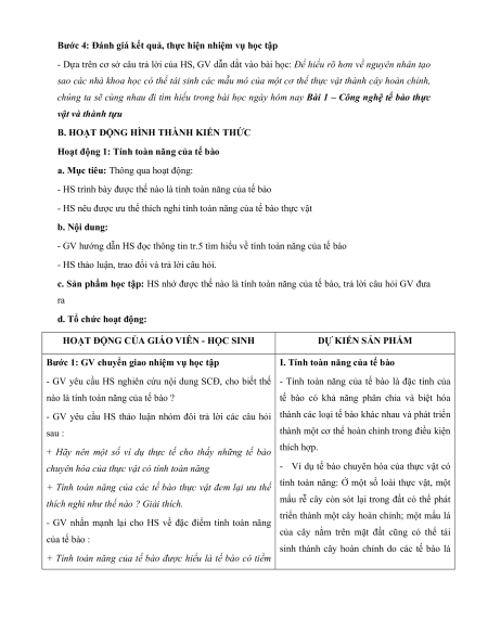 - HS nêu được ưu thế thích nghi tính toàn năng của tế bào thực vật b. Nội dung: