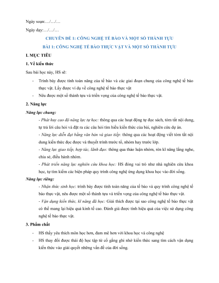 - Nêu được một số thành tựu và triển vọng của công nghệ tế bào thực vật. 2. Năng lực Năng lực chung: