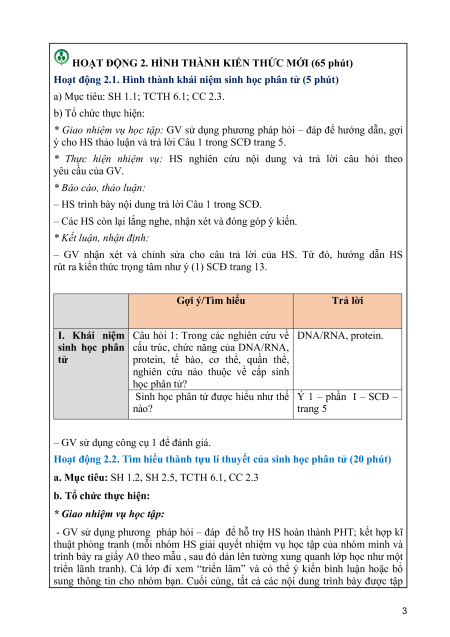 Hoạt động 2.1. Hình thành khái niệm sinh học phân tử (5 phút)