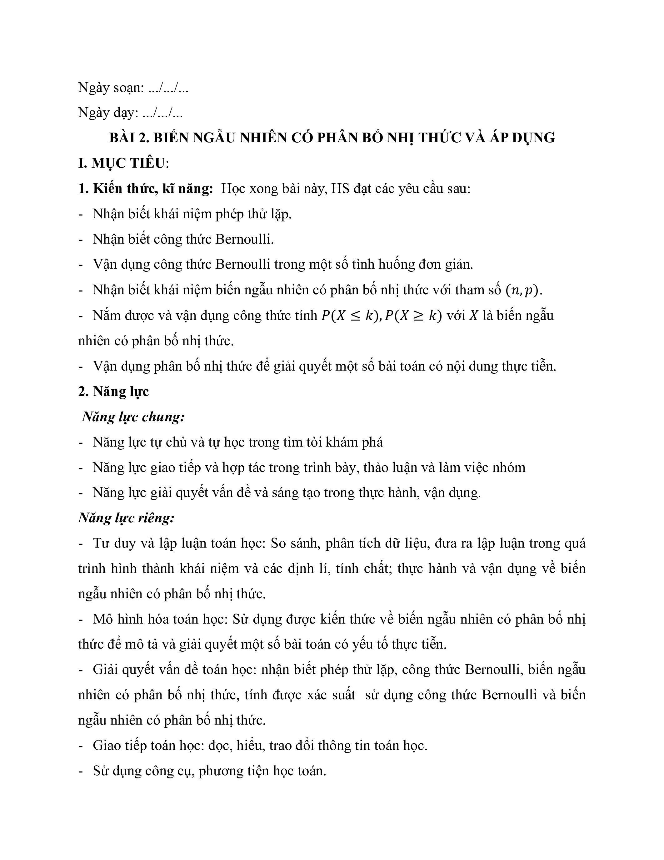 BÀI 2. BIẾN NGẪU NHIÊN CÓ PHÂN BỐ NHỊ THỨC VÀ ÁP DỤNG I. MỤC TIÊU: