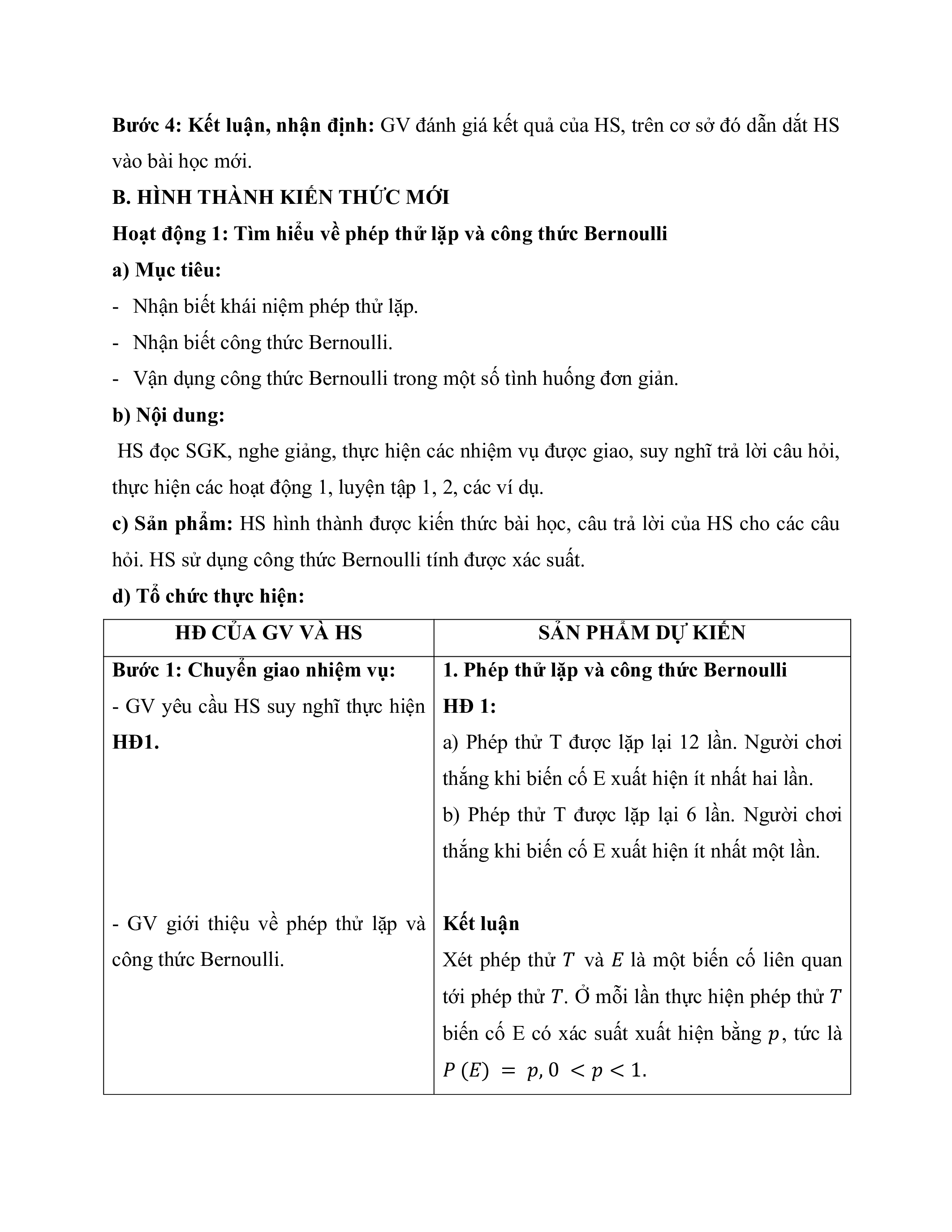Hoạt động 1: Tìm hiểu về phép thử lặp và công thức Bernoulli a) Mục tiêu: