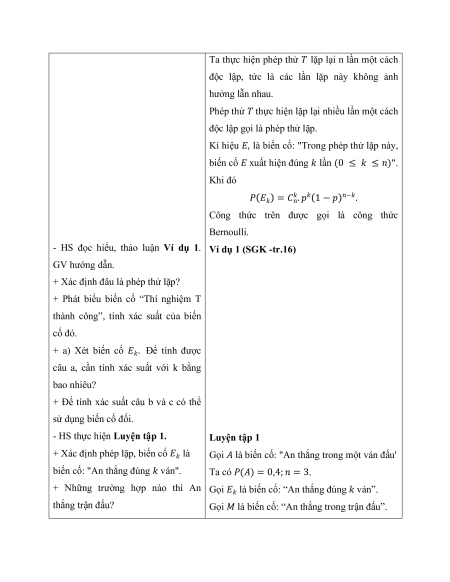 - Giải quyết vấn đề toán học: nhận biết phép thử lặp, công thức Bernoulli, biến ngẫu