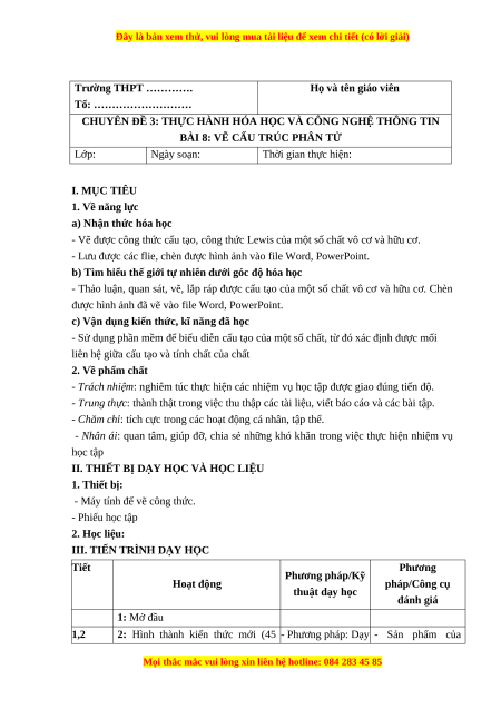 BÀI 8: VẼ CẤU TRÚC PHÂN TỬ Lớp: Ngày soạn: Thời gian thực hiện: I. MỤC TIÊU 1. Về năng lực a) Nhận thức hóa học