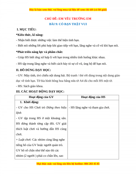BÀI 9: CÓ BẠN THẬT VUI I. MỤC TIÊU: