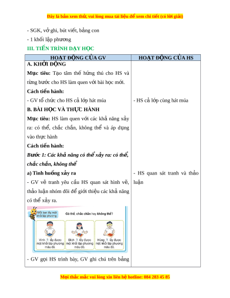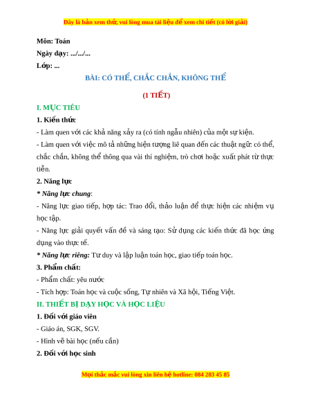 Ngày dạy: .../.../... L p: ớ ... BÀI: CÓ TH , C Ể HẮC CH N Ắ , KHÔNG THỂ (1 TIẾT) I. M C Ụ TIÊU 1. Ki n t ế h c ứ - Làm quen v i ớ các kh năng x ả y r ả a (có tính ng u nh ẫ iên) c a ủ m t ộ s ki ự n. ệ - Làm quen v i ớ vi c ệ mô t nh ả ng ữ hi n ệ tư ng ợ liê quan đ n ế các thu t ậ ng : ữ có th , ể chắc ch n,