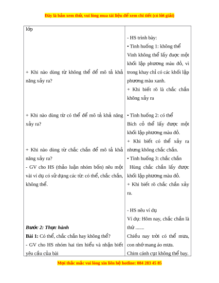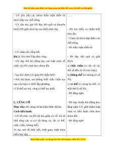 • Tình huống 3: chắc ch n ắ - GV cho HS (th o ả lu n ậ nhóm b n ố ) nêu m t ộ Hùng ch c ắ ch n ắ lấy đư c ợ vài ví d có ụ s d ử ng các ụ t : ừ có th , ch ể c ch ắ n, ắ khối l p ậ phư ng m ơ àu đ . ỏ không th . ể + Khi bi t ế rõ ch c ắ ch n ắ x y ả ra. - HS nêu ví dụ Ví d : ụ Hôm nay, ch c ắ ch n ắ là