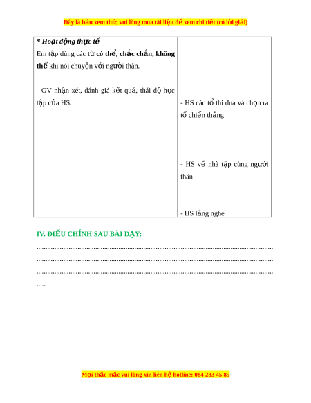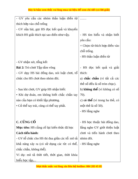 Đây là bản xem th , vu ử i lòng mua tài li u ệ đ xe ể m chi ti t (c ế ó l i ờ gi i ả ) - GV yêu c u ầ các nhóm th o ả lu n ậ đi n ề từ …… thích h p ớ vào ch t ỗ r ng ố - GV s a ử bài, g i ọ HS đ c ọ k t ế quả và khuy n ế khích HS gi i ả thích t i ạ sao đi n nh ề v ư y ậ . - HS tìm hi u ể và nh n ậ bi t ế yêu cầu: + Ch n ọ từ thích h p ợ đi n ề vào chỗ trống. - HS th o ả lu n đi ậ n t ề ừ - GV nh n xét ậ , tổng k t ế Bài 2: Trò ch i ơ T p t ậ ầm vông - HS đ c ọ k t ế quả và gi i ả - GV d y ạ HS bài đ ng ồ dao, nói lu t ậ ch i ơ , tổ thích: ch c ứ cho HS ch i ơ theo nhóm đôi.