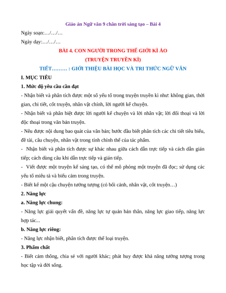 Giáo án Ngữ văn 9 chân trời sáng tạo – Bài 4 Ngày soạn:…/…/… Ngày dạy:…/…/…