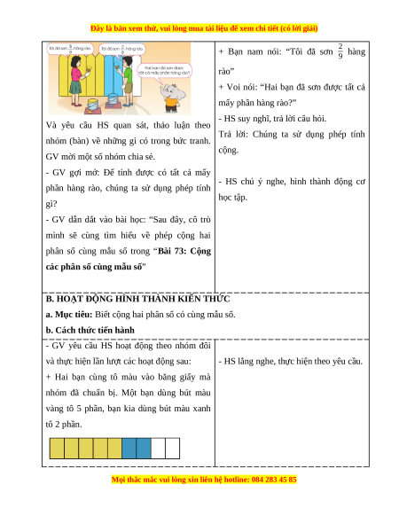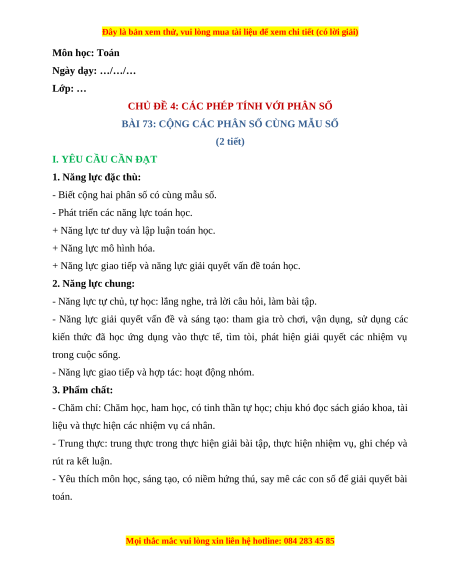 BÀI 73: CỘNG CÁC PHÂN SỐ CÙNG MẪU SỐ (2 tiết)