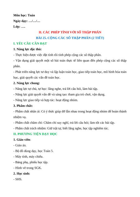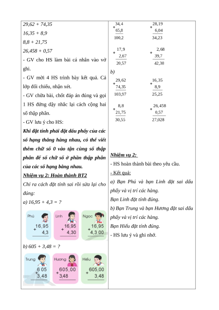 - Thực hiện được việc đặt tính rồi tính phép cộng các số thập phân.