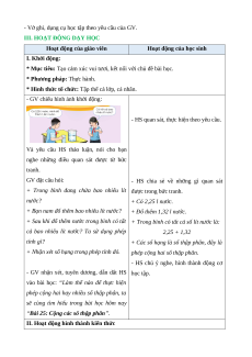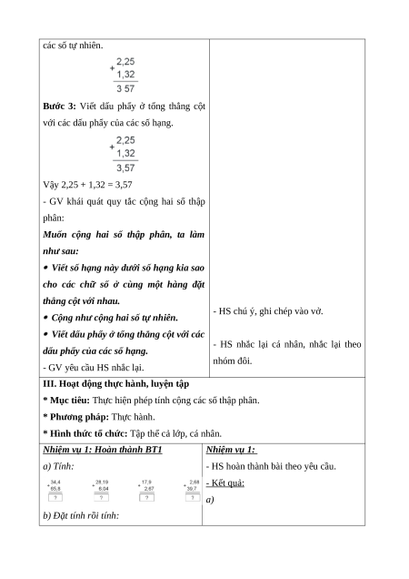 - Nhận biết và thực hiện phép cộng các số thập phân. * Cách tiến hành: