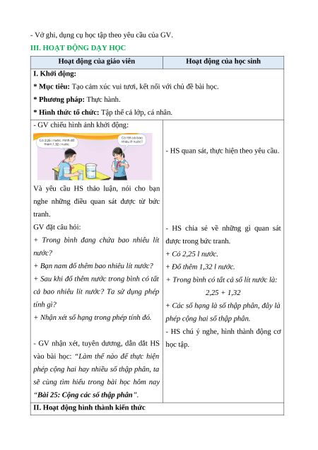 - Vận dụng giải quyết một số bài toán thực tế liên quan đến phép cộng các số thập phân.