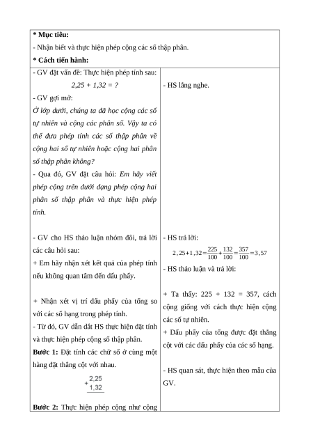 - GV đặt vấn đề: Thực hiện phép tính sau: 2,25 + 1,32 = ? - HS lắng nghe. - GV gợi mở:
