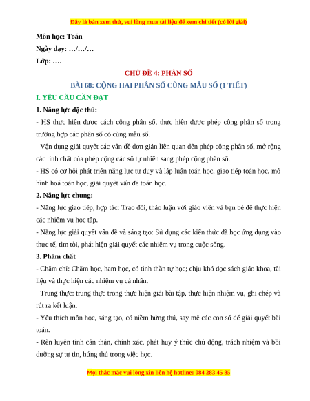 BÀI 68: CỘNG HAI PHÂN SỐ CÙNG MẪU SỐ (1 TIẾT)