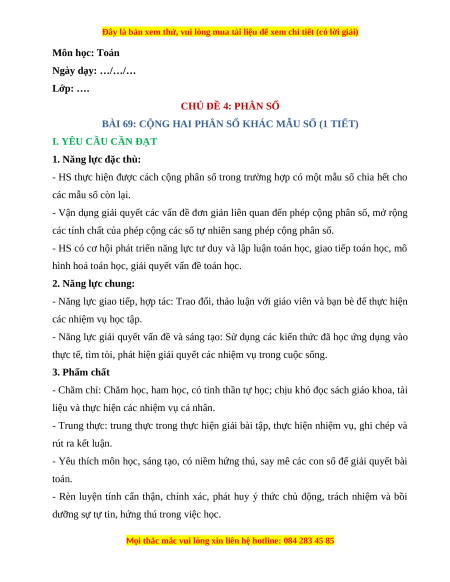 BÀI 69: CỘNG HAI PHÂN SỐ KHÁC MẪU SỐ (1 TIẾT)