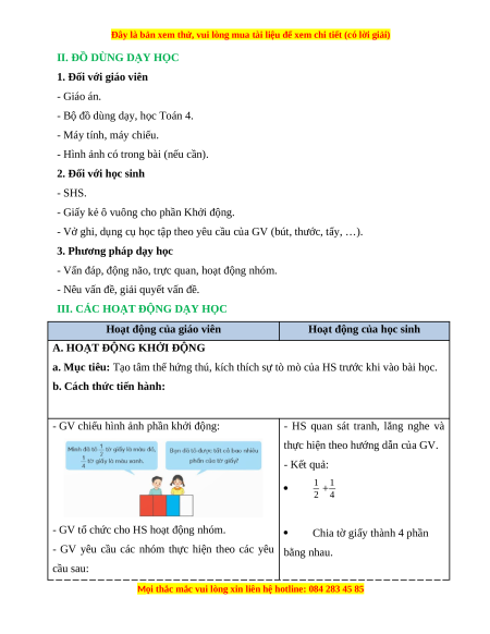Giáo án Cộng hai phân số khác mẫu số Toán lớp 4 Chân trời sáng tạo