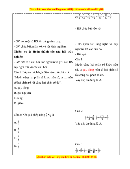 - HS nhận biết được cách cộng phân số trong trường hợp có một mẫu số chia hết cho các mẫu số còn lại. b. Cách tiến hành: