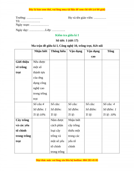 Ma trận đề giữa kì I, Công nghệ 10, trồng trọt, Kết nối